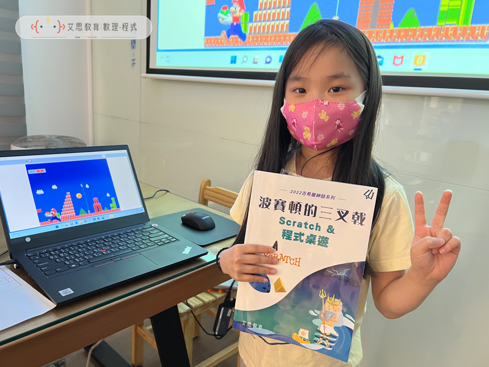 數學方面,搭配數學課學過的知識,撰寫單位換算程式,最後用Scratch進行動作遊戲設計。