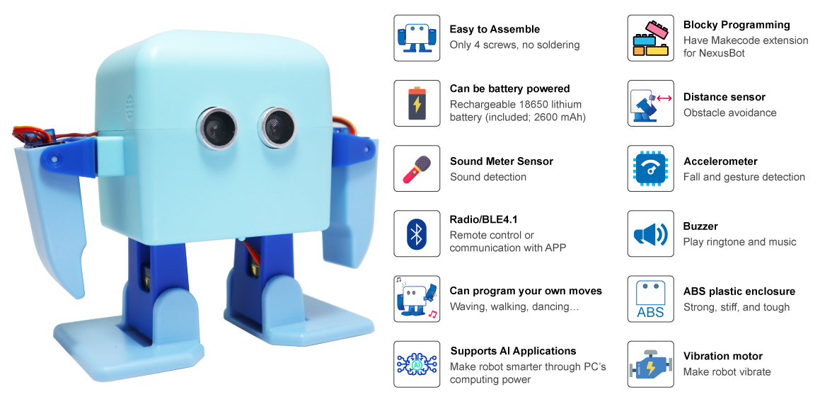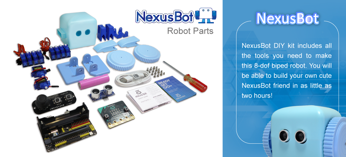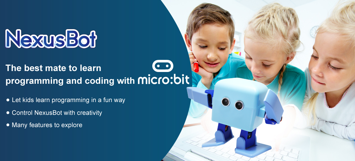 NexusBot is a programmable, intelligent robot for children to learn coding, and it is perfectly appropriate for STEAM education. NexusBot is an 8-dof biped robot which mainly consists of a core micro:bit and an exclusive Nexus:bit expansion board. Through the customized blocky code for NexusBot, children can easily program and instantly observe the robot waving, walking, dancing, making sounds, avoid obstacles, and so on depending on what the student programs it to do. Furthermore, NexusBot can also be transformed into a 2WD car! With NexusBot, children can customize and design lots of creative and fun projects.