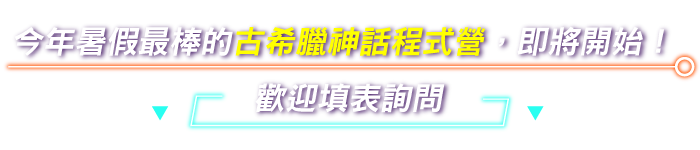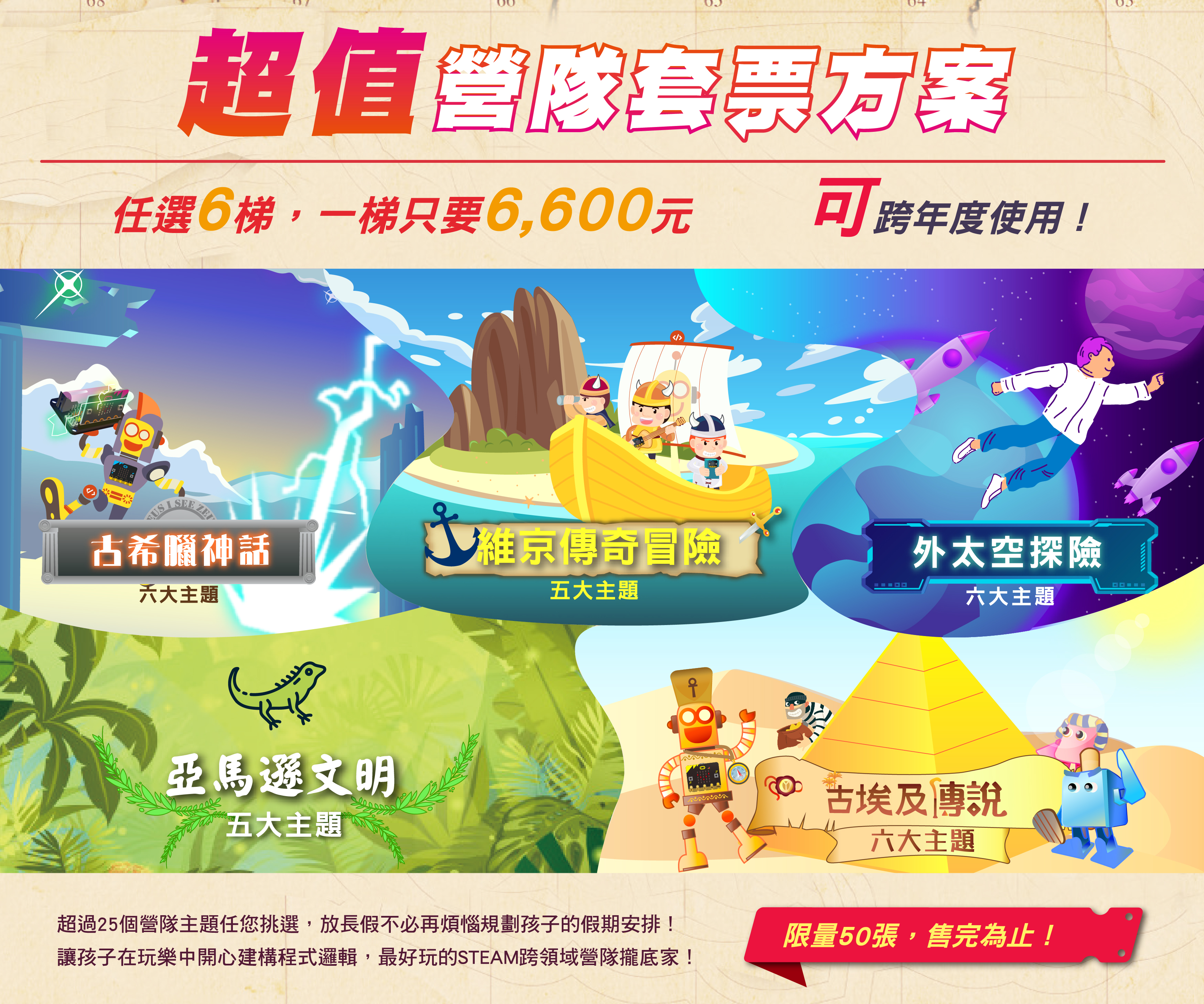 我們每期皆準備不同主題的程式營隊,在這次的古希臘神話主題裡,小朋友將化身為「希臘程式遠征隊」,並結合自己的創意與程式力解救希臘諸神! 如:二進位原理、迴圈、無線傳輸、感測器、電學知識等…,並結合自己的創意獲取獨一無二的程式力大祕寶!透過精心設計的課程編排,讓孩子不只動腦思考、動手創作, 更能透過「玩程式」進而培養「邏輯力」與「創造力」,真正玩到X學到X做到,迎向未來無限可能!
