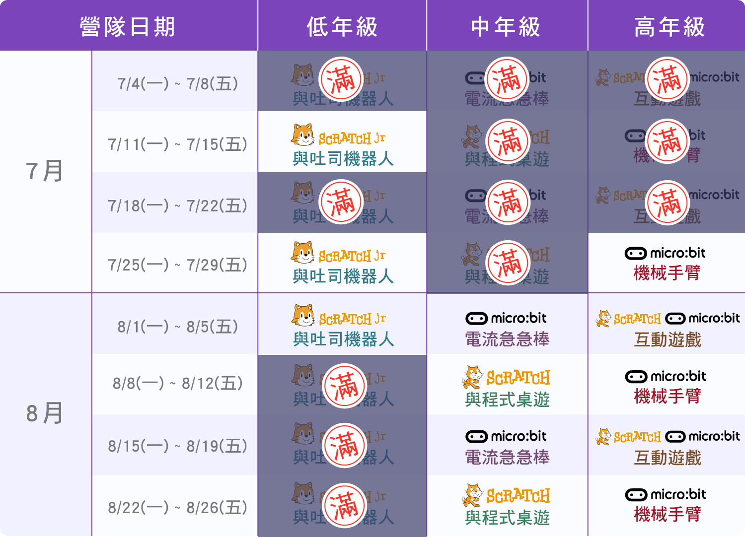 | 適合年級 | 大班~國小六年級,針對不同年紀設計最適合孩子的課程內容 ※有無程式基礎都可適合參加唷! |