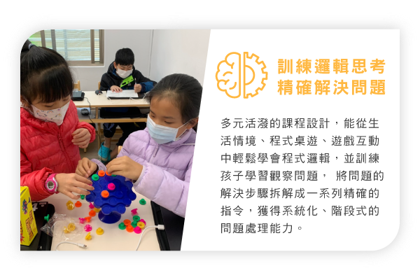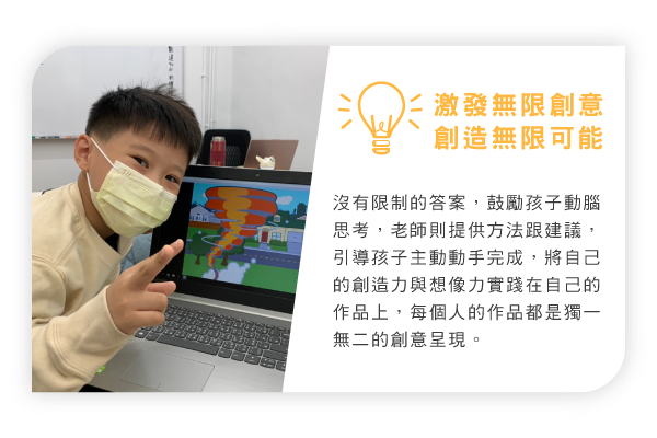 不同於坊間制式化的課程編排,我們鼓勵孩子要動腦動手+用心開心學習! 每期皆精心設計不同主題的程式營隊,情境化、 生活化的故事營造下緊扣程式觀念及知識核心,更加入許多關卡突破、動手DIY的課程設計,增添孩子動腦思考以外還可動手創作的樂趣, 讓孩子不再只是單方面對著電腦「聽課」,而是能「玩中做 做中學」,好玩、有趣、能動手做,才是引發孩子主動學習的不二法門!